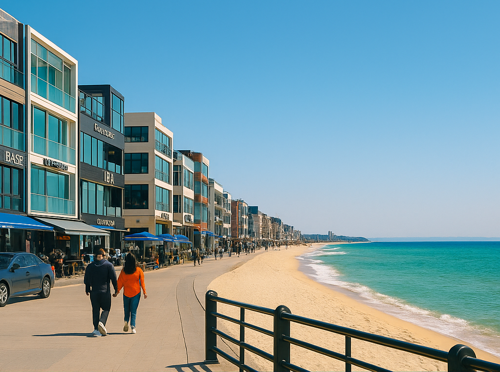 해가 지면 조명이 켜지면서 해변은 더욱 로맨틱한 분위기로 변합니다.