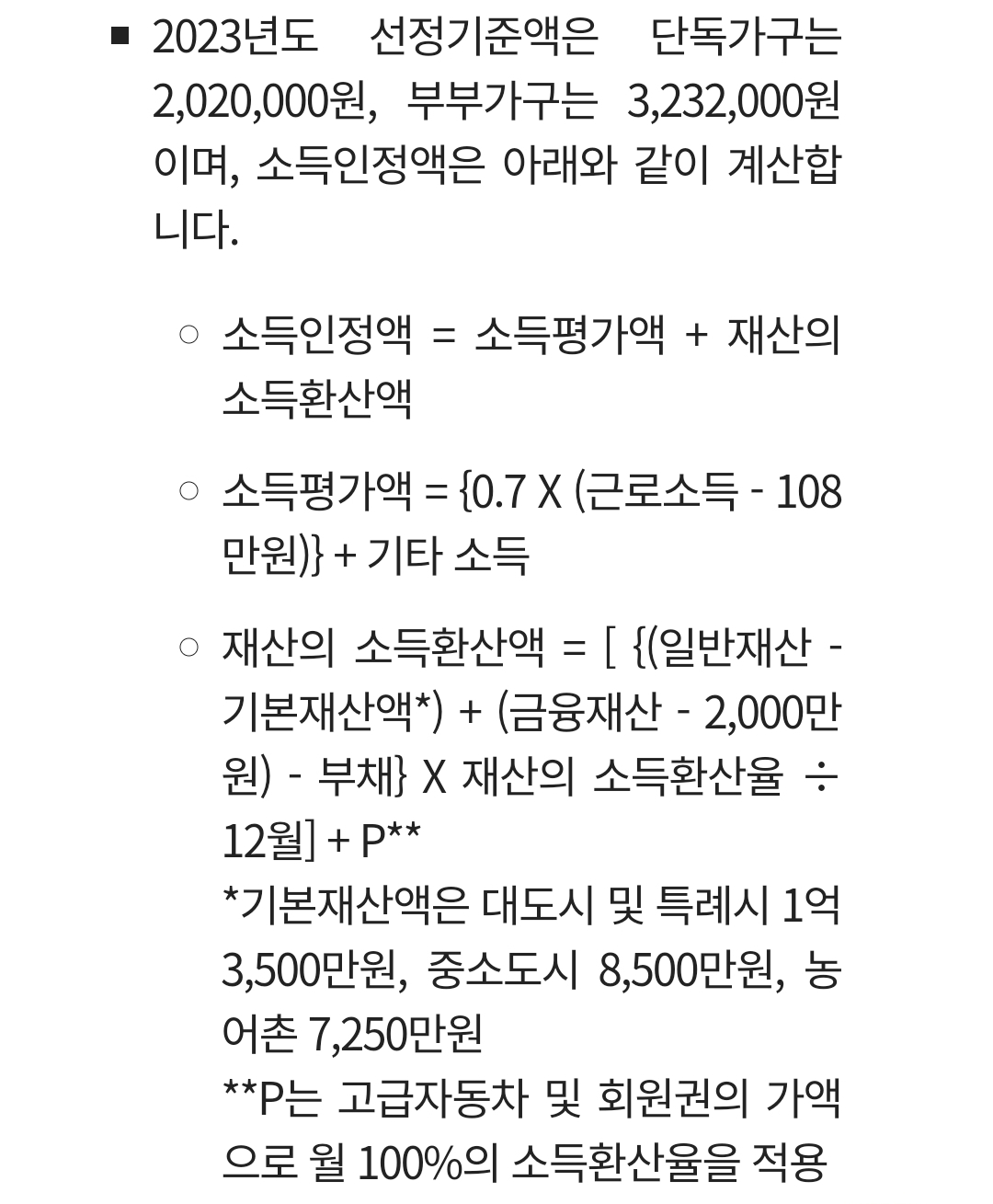 만65세 이상인 어르신으로서 소득인정액이 매년 보건복지부장관이 정하여 고시하는 금액 이하인 사람에게 지원합니다.