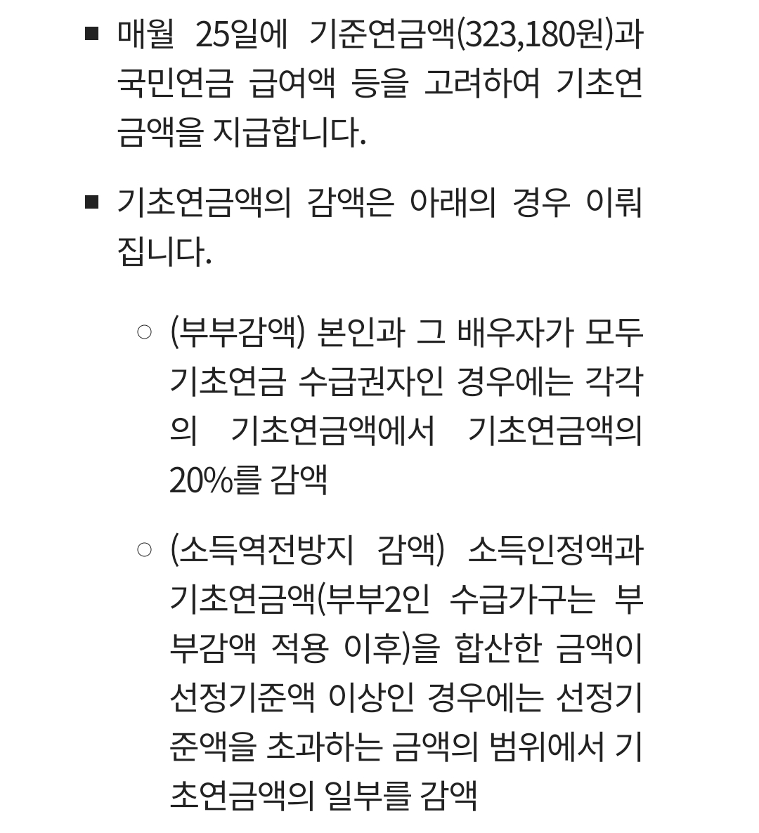 만65세 이상인 어르신으로서 소득인정액이 매년 보건복지부장관이 정하여 고시하는 금액 이하인 사람에게 지원합니다.