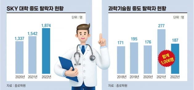 한국 최고의 과학 인재 양성소인 카이스트에서는 지난 5년간 연평균 100명이 중도 탈락했습니다. 울산과학기술원 263명, 광주과학기술원 15명, 대구경북과학기술원 94명 등 나머지 과학기술원의 5년간 중도 탁락 규모까지 합치면 1006명이 대학을 이탈했습니다. 과학 인재를 길러 내기 위해 국가가 학비를 지원하는 과학기술원과, 영재, 과학고 이공계 인재들까지 '의대 러시' 현상이 심화되고 있다는 지적입니다.