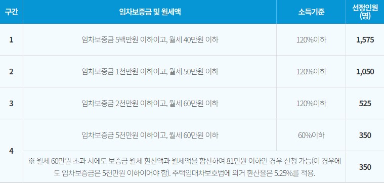 월세 60만원 초과자 중에서 보증금 월세 환산액(주택임대차보호법에 따라 환산율 5.25% 적용)과 월세액을 합산해 '81만원 이하'인 경우에는 신청할 수 있습니다.