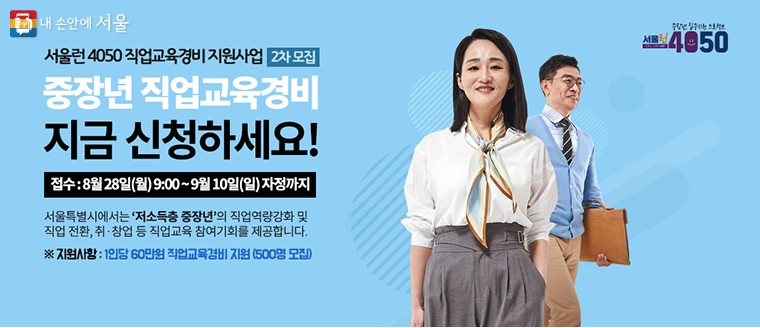 서울런4050 직업교육경비 지원사업 참여 및 지원금 신청은 8월 28일부터 9월 10일 자정까지 '서울시50플러스재단' 누리집을 통해 온라인 모집한다.