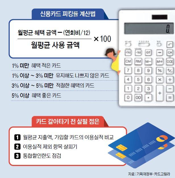 지금 쓰는 카드 혜택이 좋은지 나에게 잘 맞는 카드인지 점검하고 싶다면 '피킹률'을 확인하면 됩니다. 피킹률은 지출액 대비 신용카드 혜택이 얼마나 좋은지 평가하는 일종의 자가 진단 표입니다. 월평균 혜택 금액에서 월평균 연회비를 빼고 이를 월평균 사용액으로 나눈 값에 100을 곱하면 됩니다. 일반적으로 1% 미만이면 혜택이 적은 카드, 1% 이상 ~ 3% 미만이면 유지해도 나쁘지 않은 카드, 3% 이상 ~ 5% 미만이면 적절한 혜택의 카드, 5% 이상이면 혜택이 좋은 카드로 분류합니다.