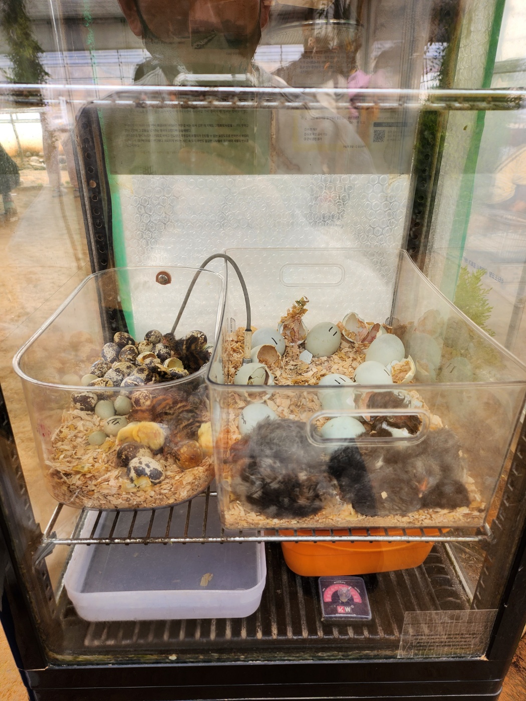 알에서 깨어난 메추리와 병아리를 따로 분리해서 관리 중입니다.