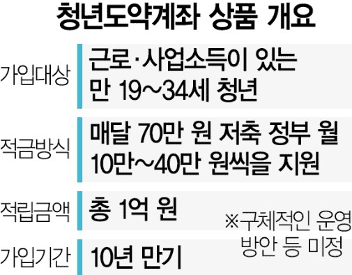 이 청년도약계좌는 그 해당 청년의 소득 수준에 따라서 매달 기준 30만원에서 70만 원을 저축하게 되면 정부가 비과세 또는 소득공제 혜택 그리고 정부 기여금인 10만 원에서 40만 원까지 기준으로 보태서 총 평균적으로 매달 70만 원을 모을 수 있도록 해주는 지원 정책입니다.