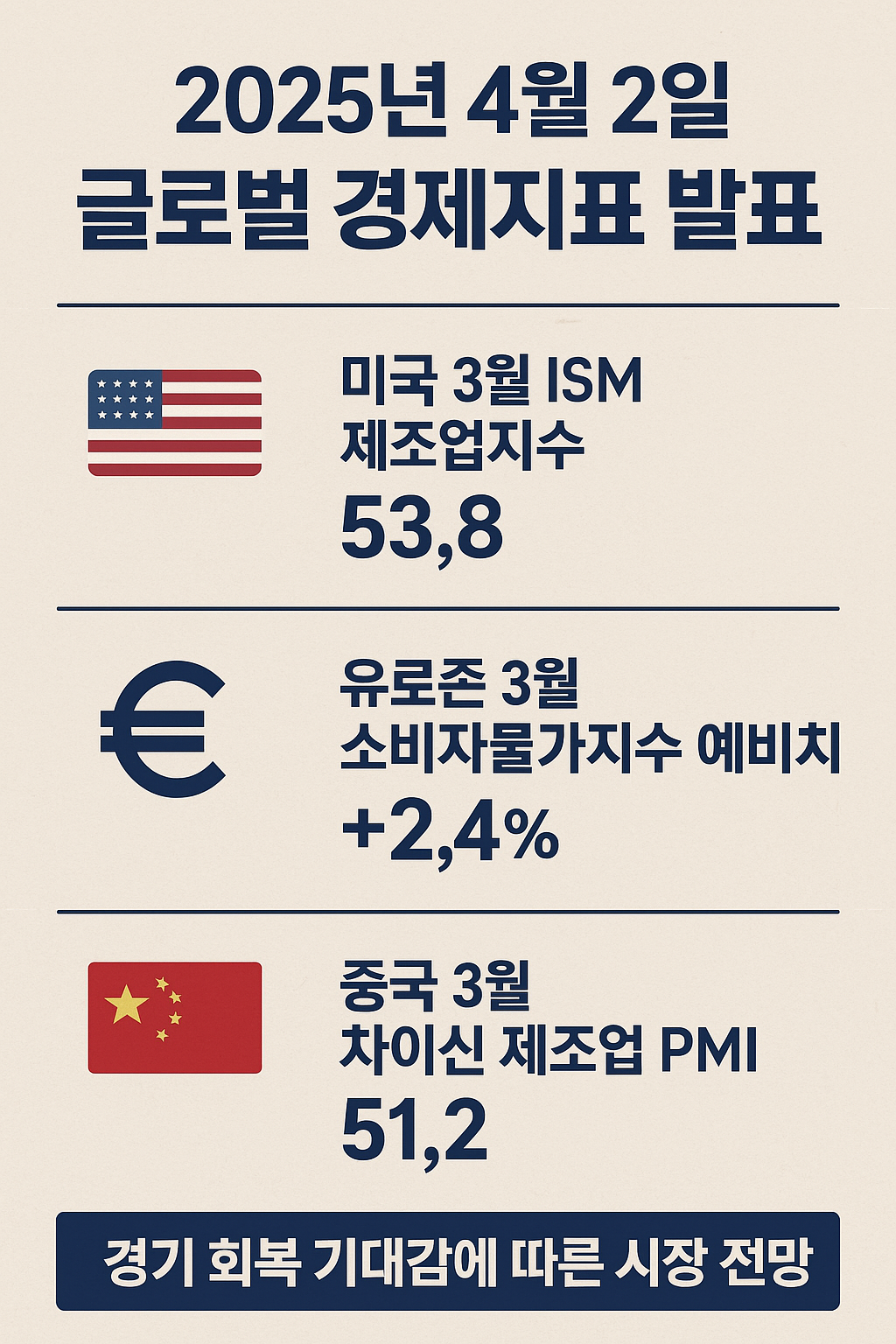 2025년 4월 2일 발표된 글로벌 주요 경제지표를 종합 정리했습니다. 미국 ISM 제조업지수, 유로존 CPI, 중국 제조업 PMI 발표 내용과 시장 영향, 향후 전망까지 확인해보세요.