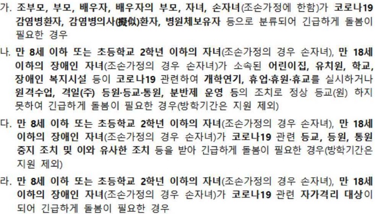 2023년 1월 1일 ~ 2023년 12월 16일까지 다음과 같은 사유로 남녀고용평등법상 가족돌봄휴가를 이용하는 근로자면 됩니다.