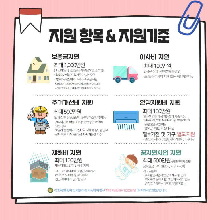- 주거 개선비: 도배, 보일러 교체, 차수판 설치 등 최대 500만 원
